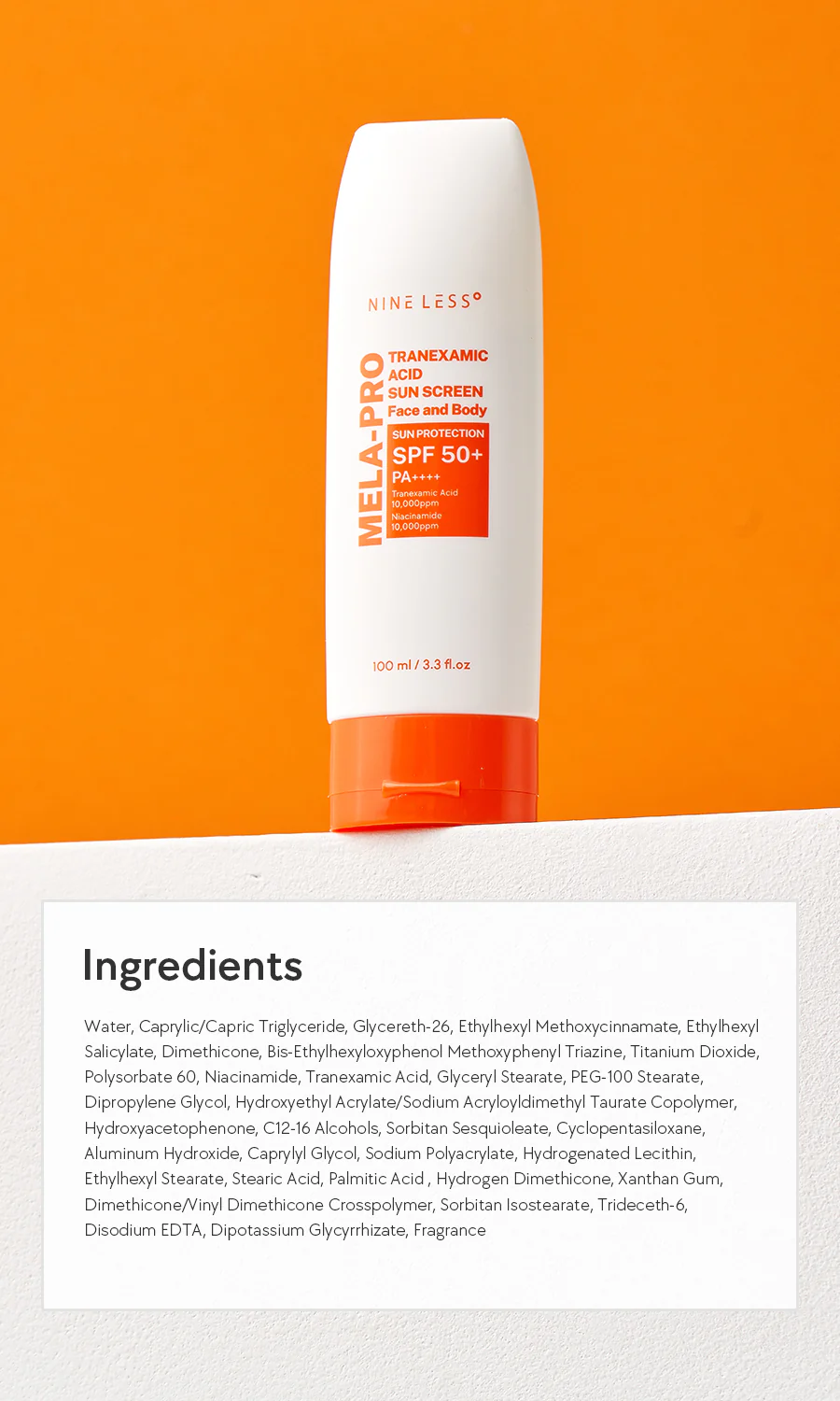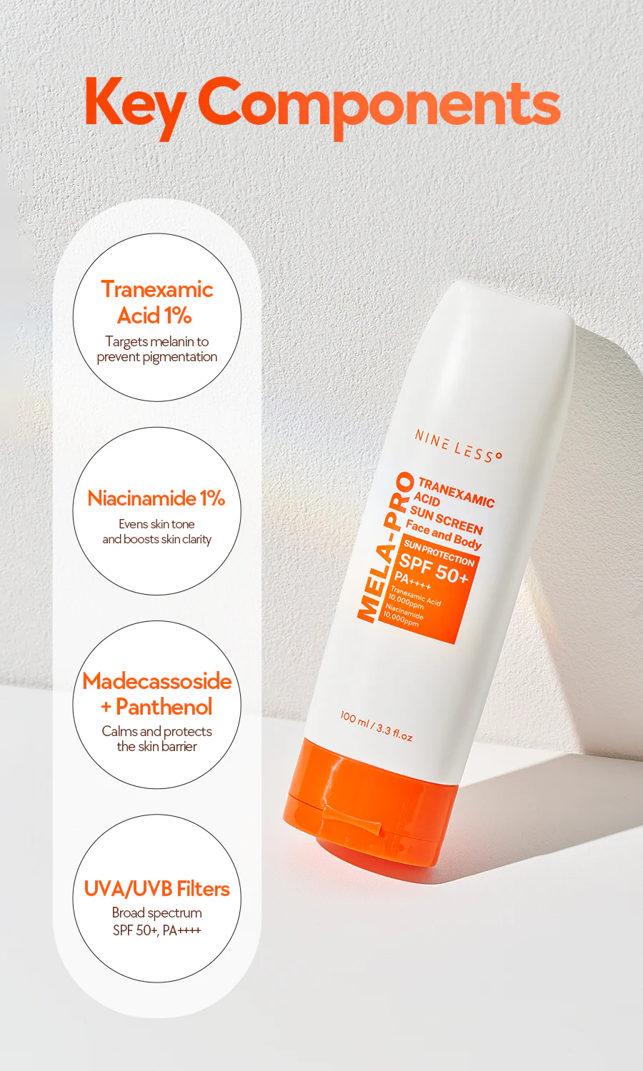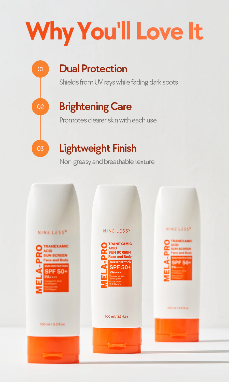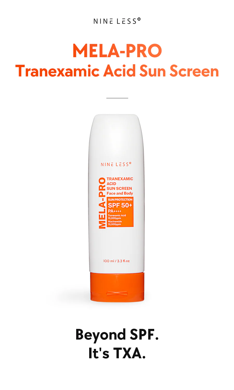 Nineless Mela‑Pro Tranexamic Acid Sun Screen is a hybrid SPF that shields your skin from UVA/UVB rays and actively helps fade dark spots, brighten your tone, and strengthen your barrier.