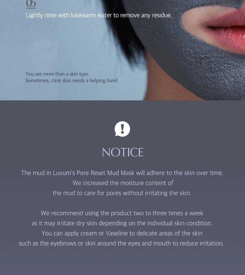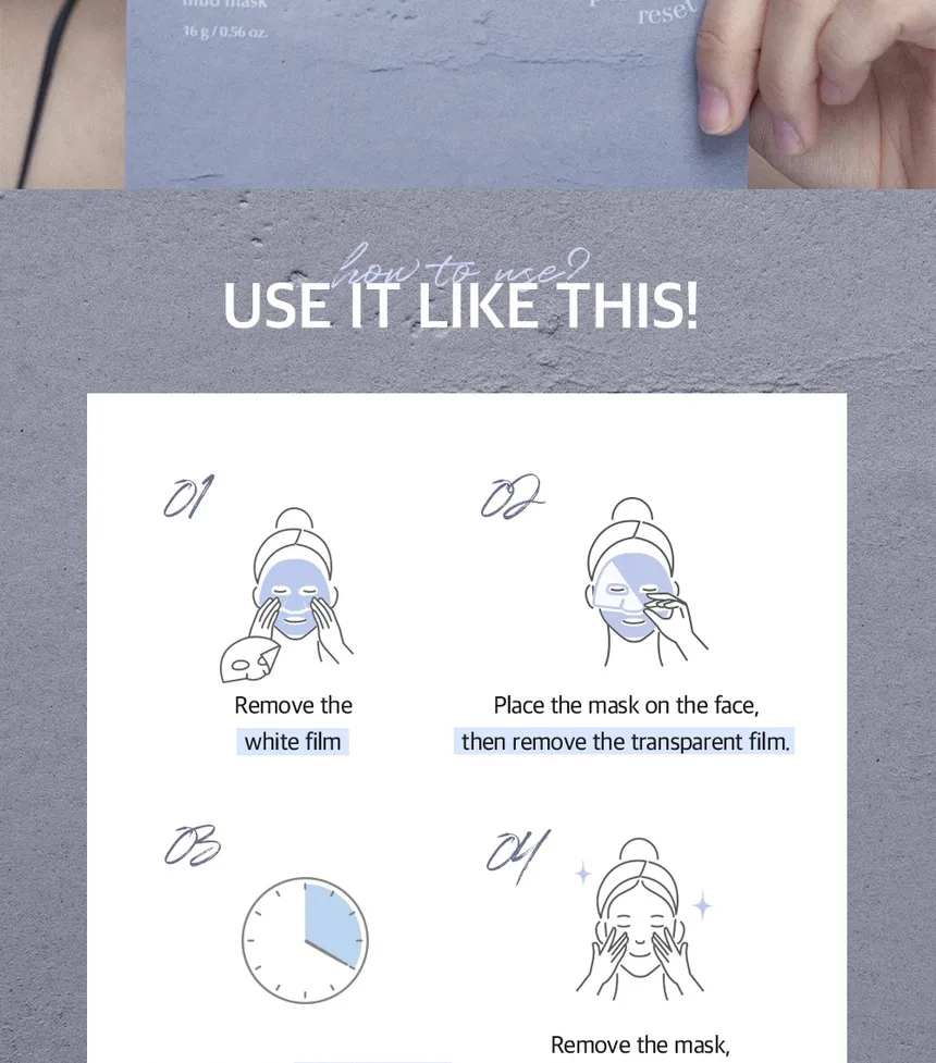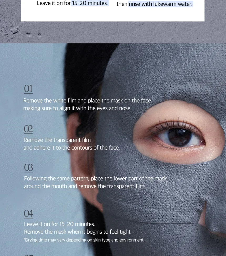 - Apply the mud sheet mask to clean skin, avoiding the eye and lip area.